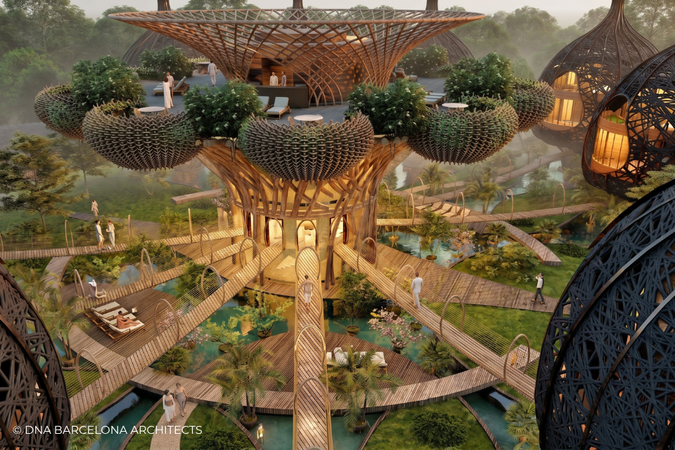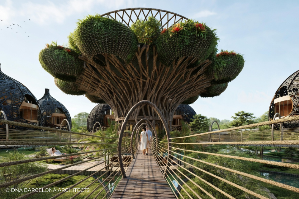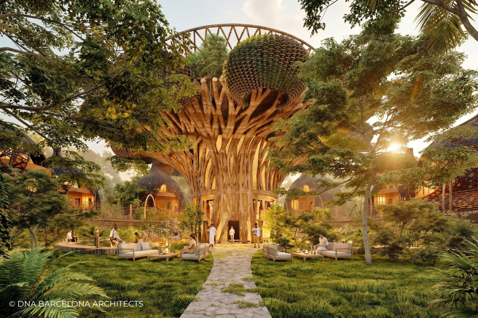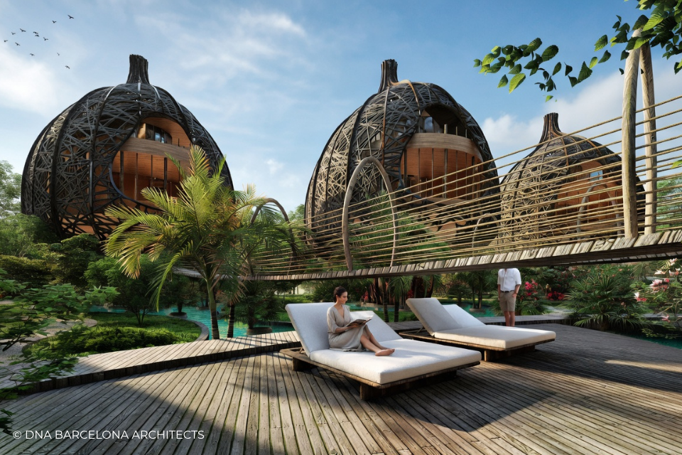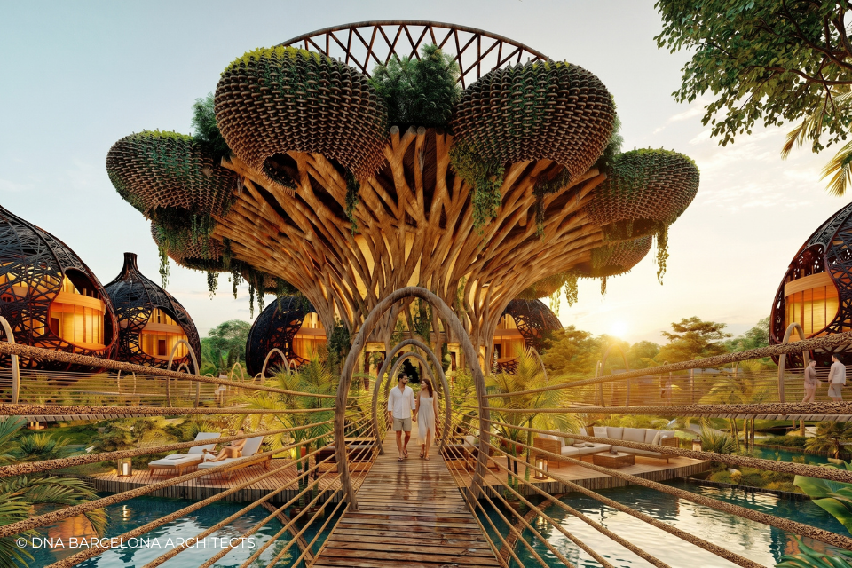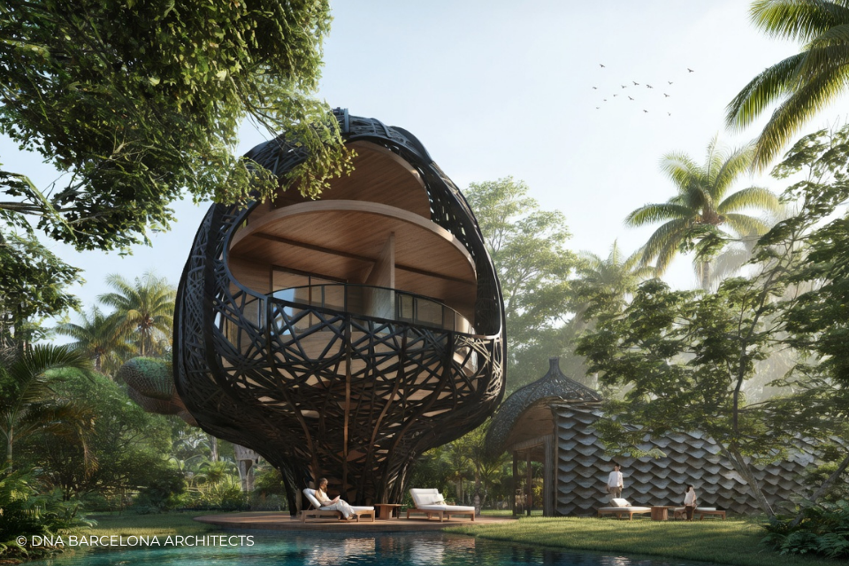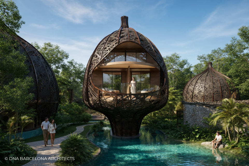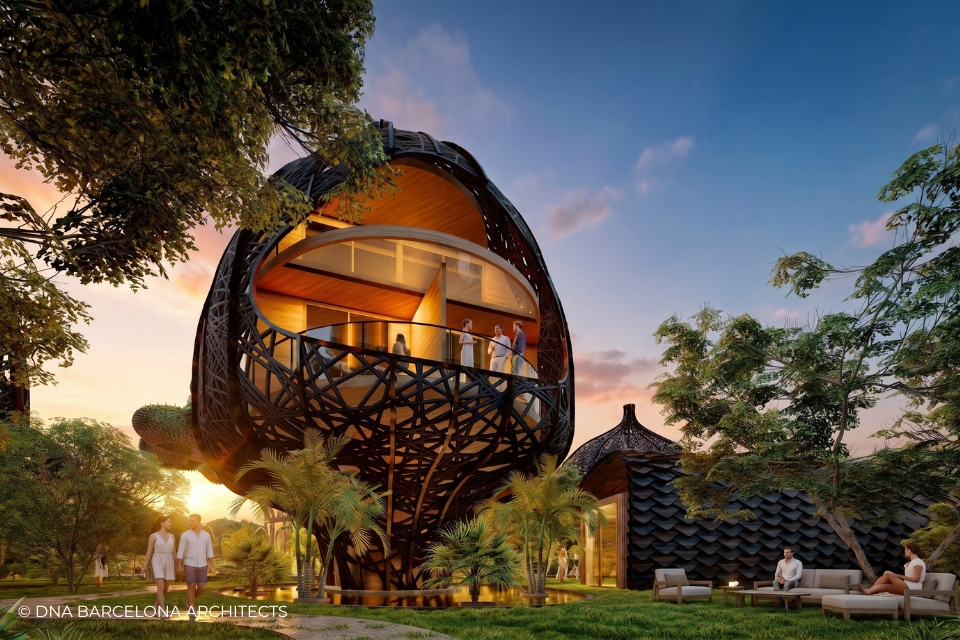 The “Life Tree” in Tulum was born from the clients desire to generate a new experience. From a conceptual point of view, in DNA we always aim towards the fusion between art and technology and in this case, we sought the fusion between nature and architecture, which generates the word, as we call it in DNA, “Archi-Nature”. In this way, we take inspiration from the bird’s nests, and from them our design process in DNA begins. This project was more about embracing nature and the jungle in Tulum, rather than the ocean, therefore an iconic project was generated from the desire to create a tree of life, with a centre from which everything revolves around, and where ten nests structures appear. The experience is enhanced by wandering through the place through walk ways, climbing from a walkway to the top of the trees and then you are in your own nest. In the end, today`s tourism has to be more oriented to nature and how to live those unique experiences, so that you return home nourished by exceptional experiences.